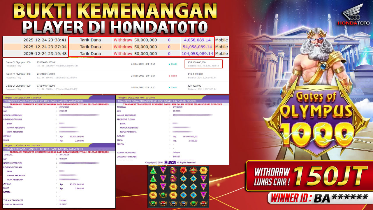 Bandar togel HONDATOTO merupakan bandar togel dan slot online yang membayar semua kemenangan member hingga lunas. Setiap pembayaran pada situs kami dilakukan dengan cara transfer ke rekening tujuan yang sudah di daftarkan pada situs togel online kami, Pembayaran hanya dapat di proses jika rekening yang di daftarkan telah valid dan dapat di transfer. Semua kemenangan member yang mendapatkan hadiah jackpot terbesar akan kami posting agar semua pemain dapat melihat bandar situs terpercaya HONDATOTO ini membayar semua kemenangan member hingga lunas. Setiap postingan yang kami posting akan kami lakukan sensor pada nomor rekening 4 digit dan nama rekening untuk menjaga privasi dan kerahasiaan member. Postingan Jackpot yang kami posting agar member atau pemain yang belum pernah bermain bisa melihat bandar togel Bukan Kaleng Kaleng Seperti HONDATOTO ini, Semua postingan jackpot yang kami posting dapat di lihat data keasliannya melalui nomor reff yang di tunjukan pada bank atau mbanking saat kita melakukan transfer.