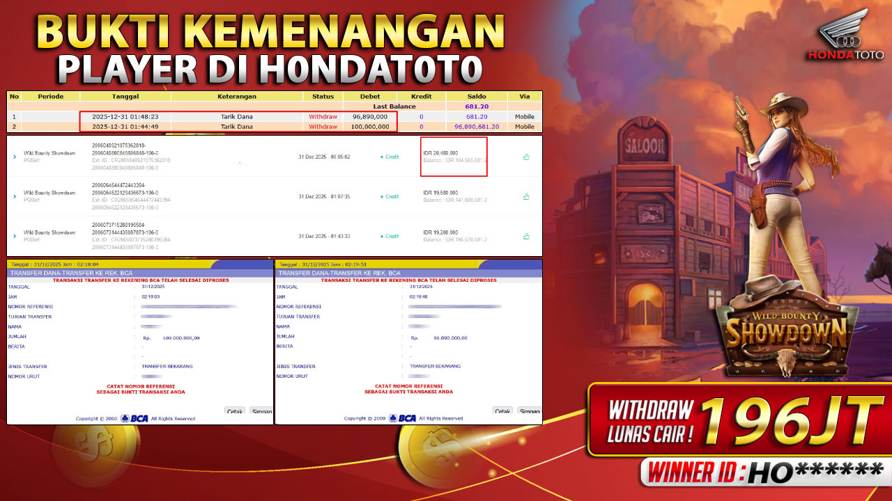 Bandar togel HONDATOTO merupakan bandar togel dan slot online yang membayar semua kemenangan member hingga lunas. Setiap pembayaran pada situs kami dilakukan dengan cara transfer ke rekening tujuan yang sudah di daftarkan pada situs togel online kami, Pembayaran hanya dapat di proses jika rekening yang di daftarkan telah valid dan dapat di transfer. Semua kemenangan member yang mendapatkan hadiah jackpot terbesar akan kami posting agar semua pemain dapat melihat bandar situs terpercaya HONDATOTO ini membayar semua kemenangan member hingga lunas. Setiap postingan yang kami posting akan kami lakukan sensor pada nomor rekening 4 digit dan nama rekening untuk menjaga privasi dan kerahasiaan member. Postingan Jackpot yang kami posting agar member atau pemain yang belum pernah bermain bisa melihat bandar togel Bukan Kaleng Kaleng Seperti HONDATOTO ini, Semua postingan jackpot yang kami posting dapat di lihat data keasliannya melalui nomor reff yang di tunjukan pada bank atau mbanking saat kita melakukan transfer.